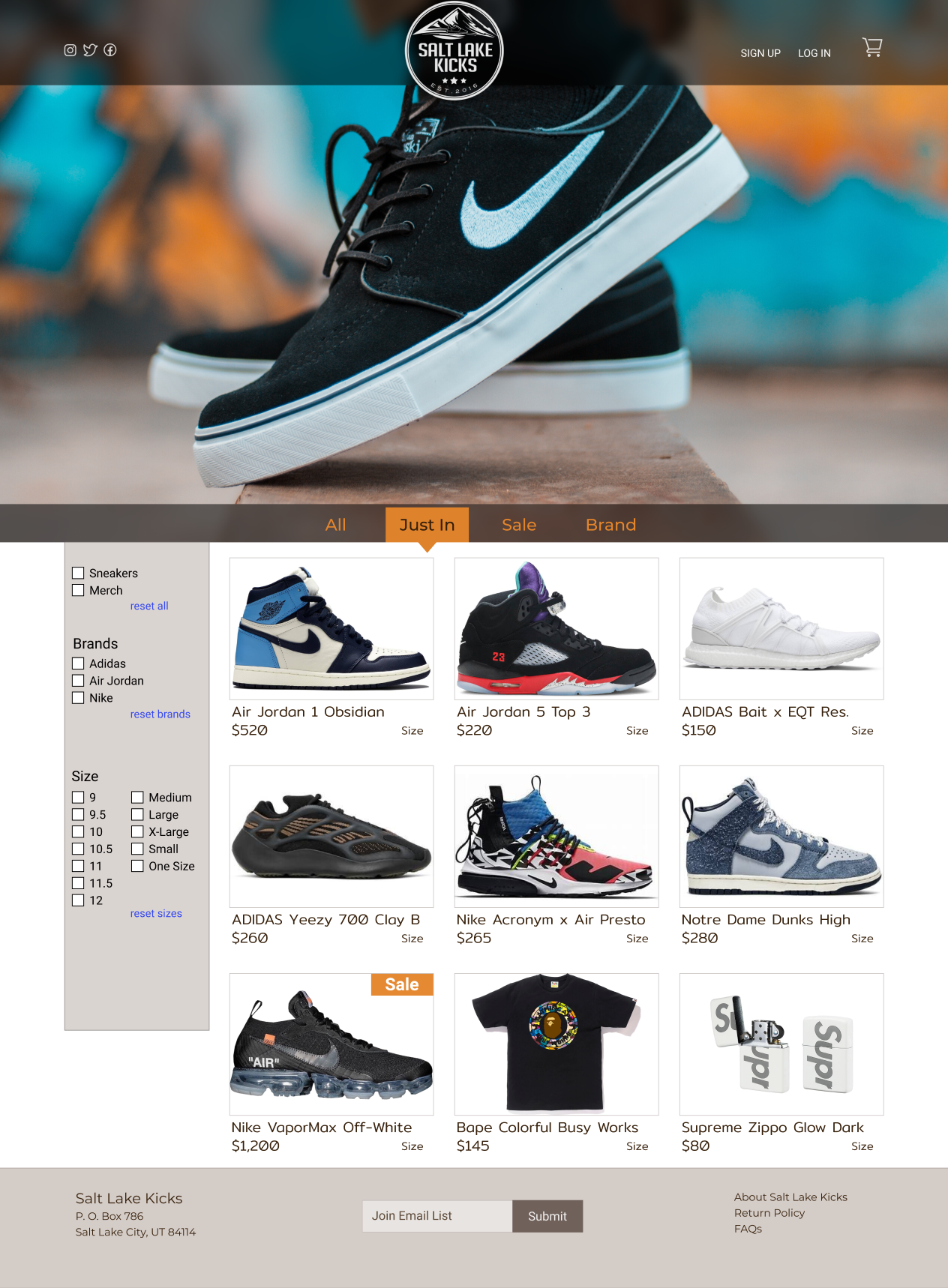 The task? Redesign the Salt Lake Kicks e-commerce website to create a user experience that allows a customer to easily scan the inventory for the styles they like, and filter for size to make the process more efficient and enjoyable.